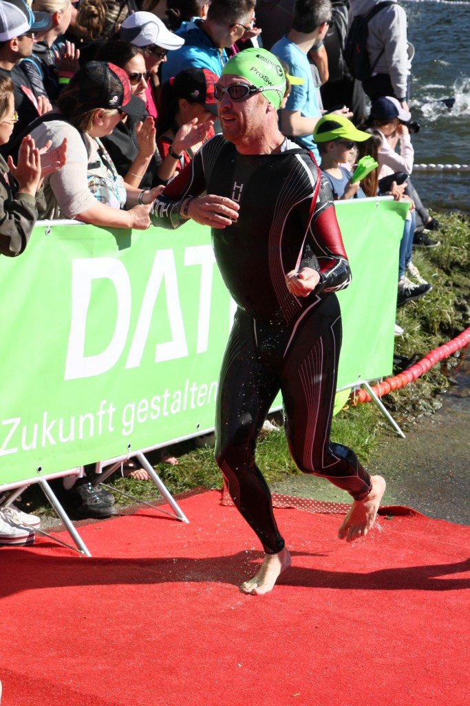 Race morning I was awake at 4am. Nerves were pretty good and I was able to eat my breakfast, put on the number tattoos and gather everything I’d need for the swim and after-race. My parents took me down to the start. My wife had made it clear she’d come and support me but she wouldn’t be waking up at that time to take me. I’ve done a few races now but nothing compares to Roth on race-morning. Walking over the bridge you get an elevated view of the swim start and T1 which was already a hive of action. Thousands of spectators were jostling for position to get a view even though there was still over an hour to go until the pros set off.