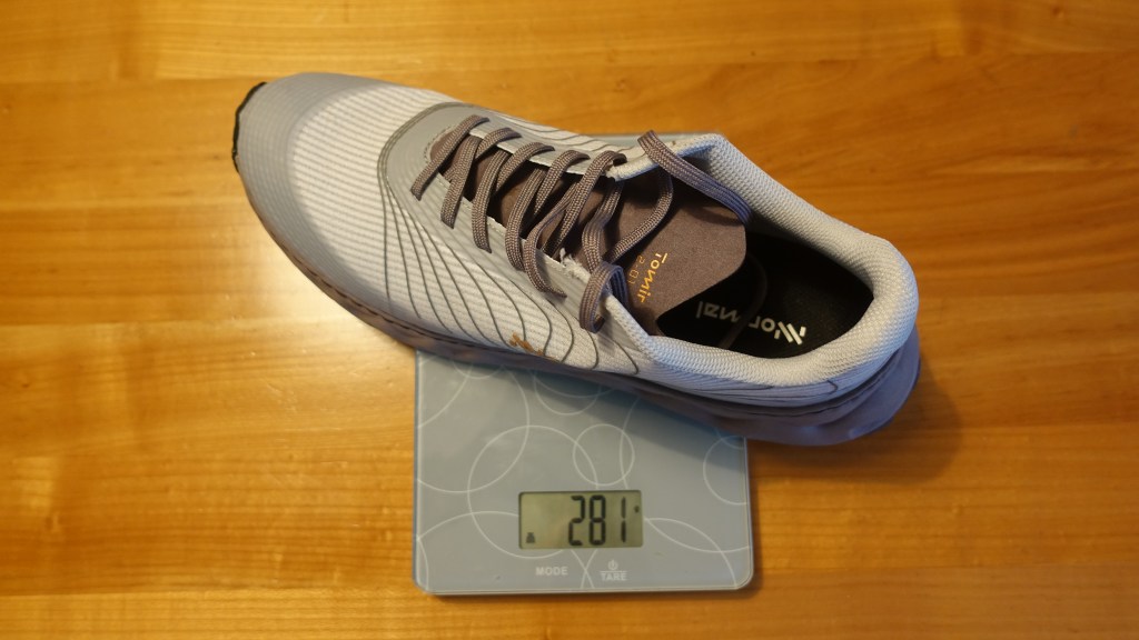 In my size the shoe tips the scales at 281g which compares favourably to the 310g for a size 44 Hoka Speedgoat 3 which the Tomirs will be replacing. I love the Speedgoats but unfortunately their days are numbered and will soon need to be dumped into the recycling bin.
